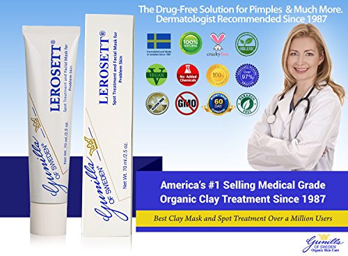 -. Binding : Misc. -. Brand : Gunilla Of Sweden -. EAN : 0856540005001 -. Feature : America's #1 selling Medical Grade Organic Clay Treatment since 1987 / A favorite among thousands of Dermatologists, skin care professionals, and acne sufferers / 100% heat-treated, mineral rich, organic clay / Up to 5x more healing power than other clay treatments / No dyes, synthetic ingredients, or added chemicals -. Label : Gunilla of Sweden® Organic Skin Care Since 1987 -. Manufacturer : Gunilla of Sweden® Organic Skin Care Since 1987 -. MPN : 2000 -. PackageQuantity : 1 -. PartNumber : 2000 -. ProductGroup : Beauty -. ProductTypeName : BEAUTY -. Publisher : Gunilla of Sweden® Organic Skin Care Since 1987 -. Studio : Gunilla of Sweden® Organic Skin Care Since 1987 -. Title : LEROSETT® Organic Acne Clay Treatment Mask 2.5 Oz- -. UPC : 856540005001