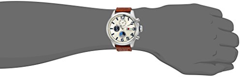 Stainless steel case with a brown leather strap. Fixed stainless steel bezel. Beige dial with luminous silver-tone hands and index and Arabic numeral hour markers. Minute markers around the outer rim. Dial Type: Analog. Luminescent hands. Three multi-function sub-dials displaying: 24 hour, date andd day of the week. Quartz movement. Scratch resistant mineral crystal. Solid case back. Case size: 44 mm. Case thickness: 13.2 mm. Round case shape. Band width: 22 mm. Tang clasp. Water resistant at 50 meters / 165 feet. Functions: date, day, hour, minute, second, 24 hour. Casual watch style. Tommy Hilfiger Jackson Multi-Function Beige Dial Mens Watch 1791239.