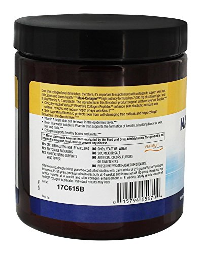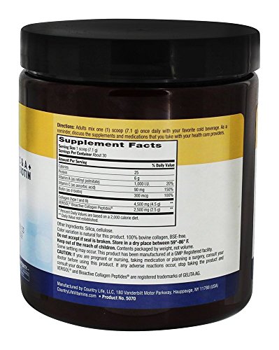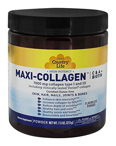 -. Binding : Health and Beauty -. Brand : Country Life -. EAN : 0015794050704 -. Feature : MADE WITH VERISOL - Clinically studied Verisol Bioactive Collagen Peptides promote enhanced skin elasticity, promote an increase in skin collagen by as much as 60% and support reduction of depth of eye wrinkles. / SUPPORTS CELL PROTECTION - Skin supporting Vitamin C protects skin from cell-damaging free radicals and helps collagen formation in the dermis layer. / CONTAINS ABSOLUTELY NO - GMOs - Yeast - Wheat - Soy - Milk - Salt - Preservatives - Artificial Colors - Artificial Flavors - Artificial Sweeteners - Magnesium Stearate / GLUTEN FREE - Gluten Free Certification for this Dietary Supplement provided by GFCO.org. / COUNTRY LIFE PLEDGE OF INTEGRITY - means that every product we provide comes with a guarantee of high quality and purity in every bottle. -. IsAdultProduct : 0 -. Label : Country Life -. Manufacturer : Country Life -. MPN : CLF05070 -. PackageQuantity : 1 -. PartNumber : CLF05070 -. ProductGroup : Health and Beauty -. ProductTypeName : HEALTH_PERSONAL_CARE -. Publisher : Country Life -. Size : 7.5 oz (213 g) -. Studio : Country Life -. Title : High Potency MAXI-SKIN Collagen Country Life 7.5 oz (213 g) Powder -. UPC : 015794050704