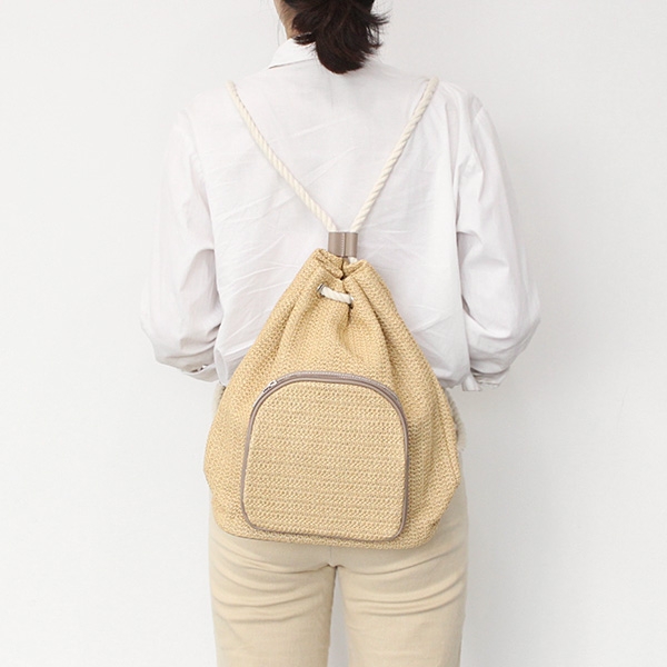 |  보기만해도 시원해지는 비스코스 소재의 여름 백팩! 바캉스룩, 마린룩에 찰떡 매칭할 수 있는 가방이에요 복조리 스타일로 가방 입구를 조여서 오픈클로징 하는 방식으로 내추럴한 무드가 느껴져요 넉넉한 사이즈로 여름 내내 멋스럽게 연출하기 좋답니다 가방 전면에 미니포켓과 안쪽 지퍼포켓으로 실용적인 수납공간도 더해주었어요 상세페이지 확인 후 굿초이스 해주세요! *모델 착용 컬러 - BEIGE(베이지) / IVORY(아이보리)         | COLOR | 베이지 / 아이보리 | | 제품 색상은 모니터에 따라 실제 색상과 차이가 있을 수 있습니다. | | | | FABRIC | 비스코스 | | | | PRODUCTION | 제조국 / 중국 | | 품질보증기준 / 소비자분쟁 해결기준에 따름 | | A/S 책임자 및 고객센터 / 감성가방 | | | | SIZE INFO | 사이즈는 측정 방법에 따라 1~2cm의 차이가 있을 수 있습니다. | | 스트랩 길이는 연결 고리를 제외한 길이이며, 최대 길이입니다. | | (단위:cm, g) | | 가로 길이 | 세로 길이 | 너비 | 손잡이 높이 | 스트랩 길이 | 무게 | | 34 | 35 | 13 | - | 102 | 460 | |