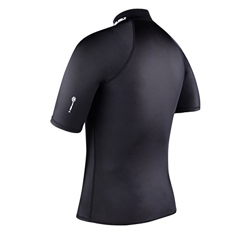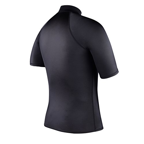 >UPF 50 -- UVA and UVB protection protects you from sunburn and long-term skin damage (such as skin cancer) while you enjoy yourself swimming, canoeing, boating, surfing, snorkeling, diving and other water sports with dear friends and family on the beach at weekends, on holidays or any other time you can get out there to have the fun you deserve! >Breathable and Quick-drying Fabric -- Breathable, lightweight and quick-drying fabric gives you maximum comfort no matter whether you are in or out of the water and protects your skin from irritation; allowing your skin stay cool and comfortable. >Stand-up Collar Design -- The stand-up collar provides you extra neck coverage for better protection from the sun's harmful rays. >Elbow Sleeves -- Elbow Sleeves give you enough room to move comfortably. Product Specifications: - Various color available: black, neon green - Material: 88% polyester, 12% spandex, 170g fabric - Size: S/M/L/XL/XXL - Package: each in a PP bag - Slim fit but not tight - Super 4-way stretch Fabric - Item includes 1 * Rashguard Top