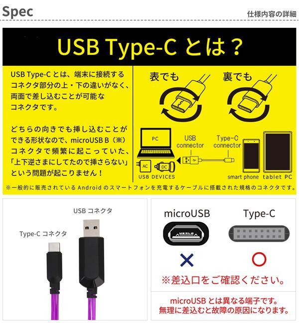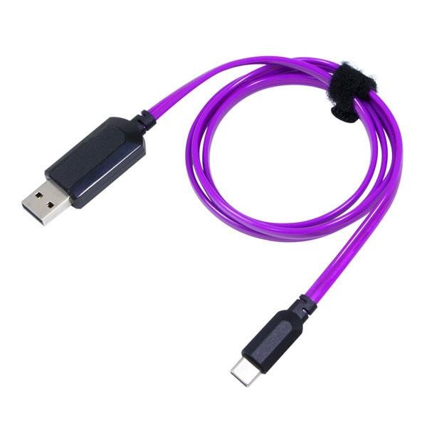 Type-C搭載の機器に使用できる、充電とデータ通信に対応したUSBケーブルです。バッテリー残量によって光の流れる速度が変わり、おおよその充電量を目視で確認する事ができます。充電開始と共に光を放ち、暗闇で使用するとよりイルミネーションを堪能できます。 |