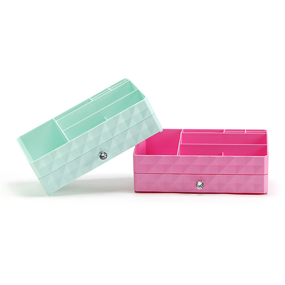 It has two layers. The first layer, with 9 grids, has big capacity. The second layer is drawer design, you can put some valuable or fragile stuff in drawer. It can help you save space and say goodbye to mess.