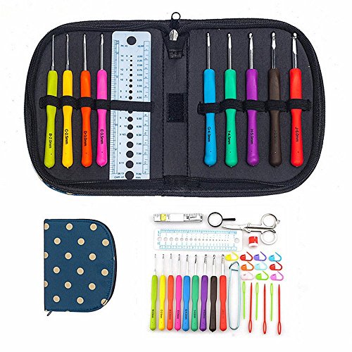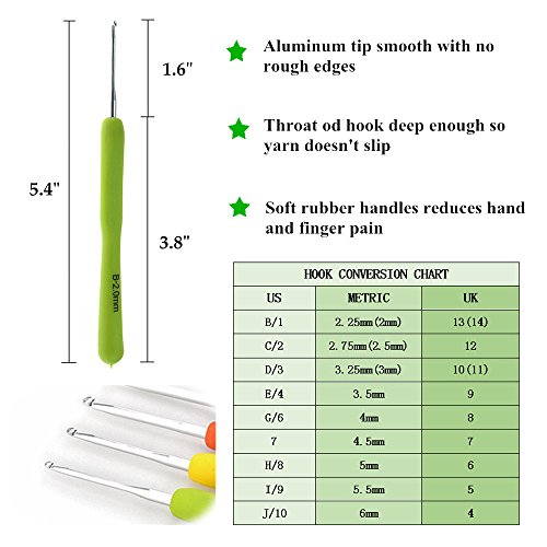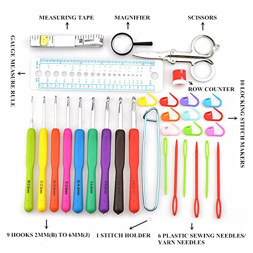 - CONNECT & CARRY ON FAMILY TRADITIONS – Everything you need's crochet set to teach your kids or grandchildren to crochet is included in this crochet kit.From a basic chain to an advance post stitch, our 31 tools and hooking accessories would make our Grandma proud. The crochet hooks sizes are standard in mm from 2, 2.5, 3, 3.5, 4, 4.5, 5, 5.5, 6. Every crochet needles has a plastic handle - color coded and printed with both letters and numbers,so you’ll never be confused which crochet hooks work.