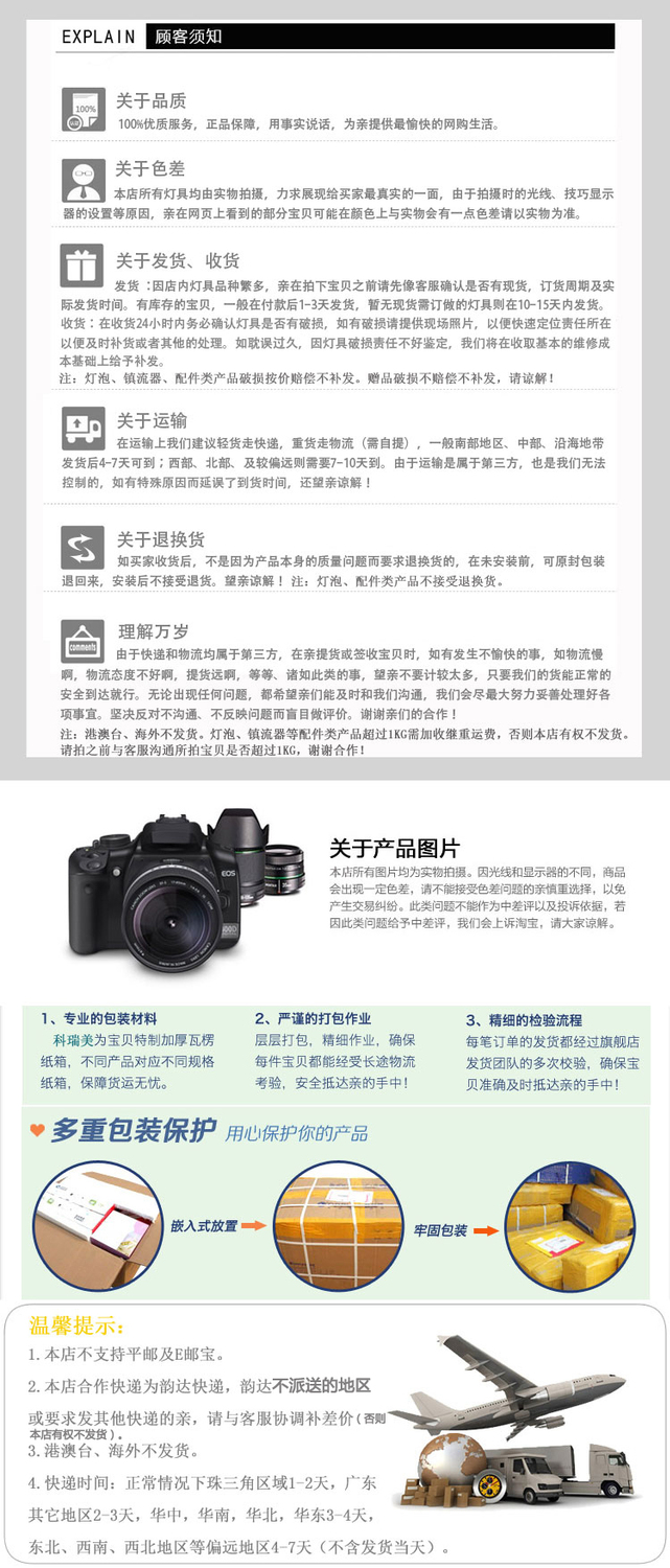 1, product profitability, not counter-offer is not free shipping, cooperation Express rhyme delivery, to ensure first time delivery, but does not guarantee the time of receipt, because we can not control, dispatch will be using SF to pay postage.