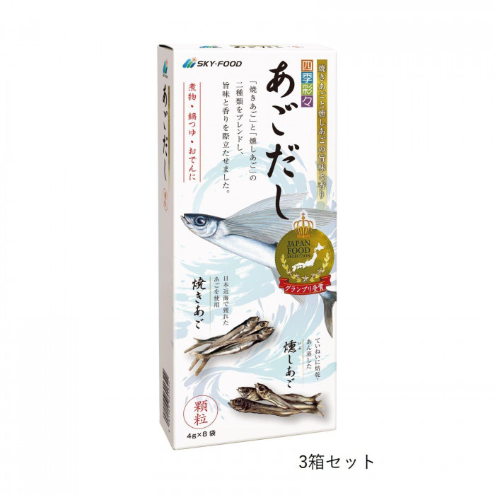 国内産のあごを天日で干した「干しあご」、さらに燻して香りを付けた「燻しあご」の二種類をブレンドし、沖縄海水塩100%の焼き塩と共に旨みと香りを際立たせました。顆粒状で少量でも使いやすく、みそ汁や煮物、おでんなどの他、お湯に溶かしただけでお吸い物としてもお召し上がりいただけます。化学調味料は使用しておりません。 |