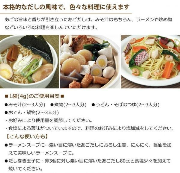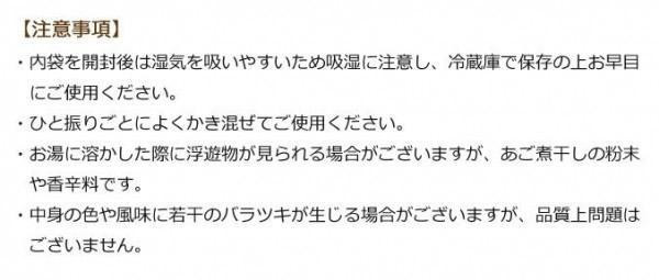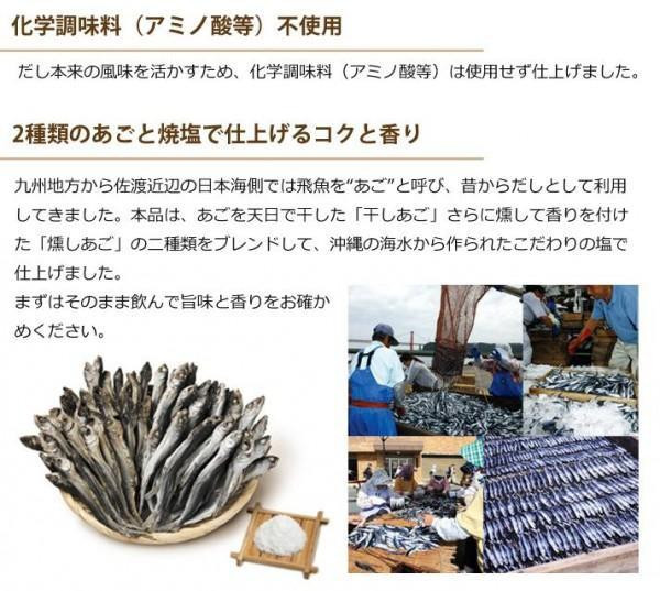 | 原材料 | 名称:あごだしの素 飛魚煮干し粉末、食塩、甜菜糖、酵母エキス |