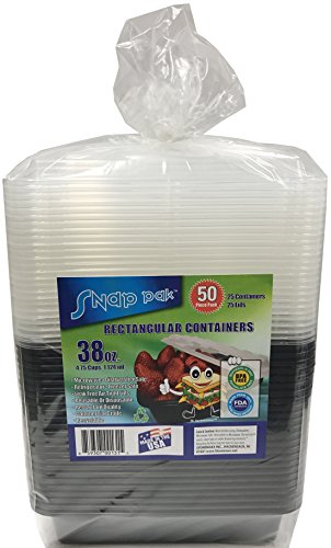 StoreMaxx Snap Pak 50 Piece Pack (25 bases, 25 lids) Rectangular Food Storage Containers, 38 oz., Black Base/Clear Lid, #131, 100% Food Safe PBA Free, Made in the USA