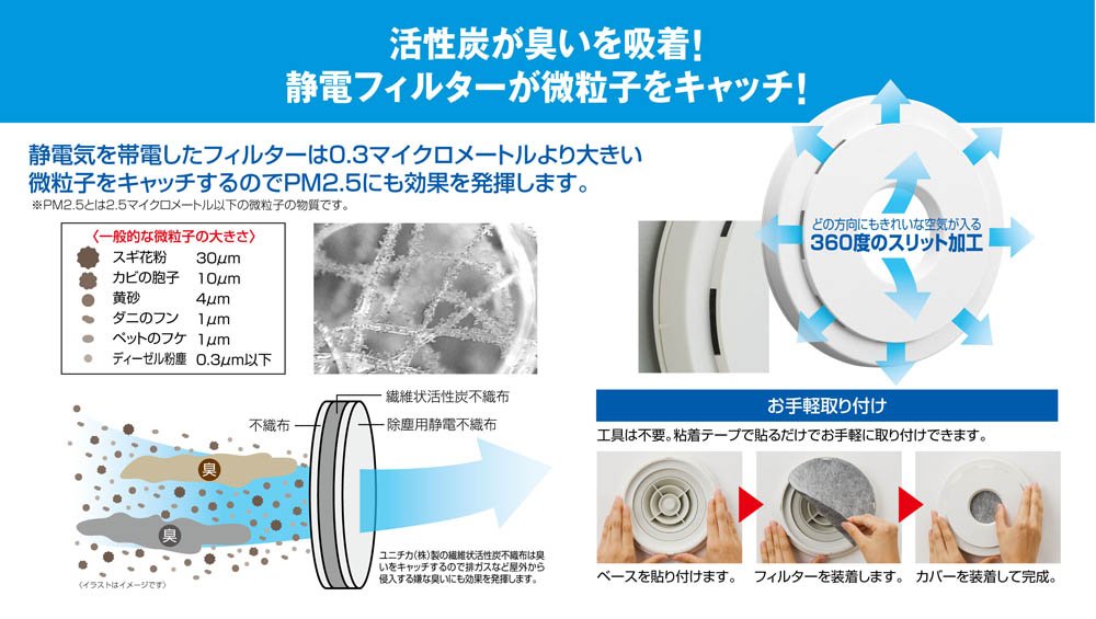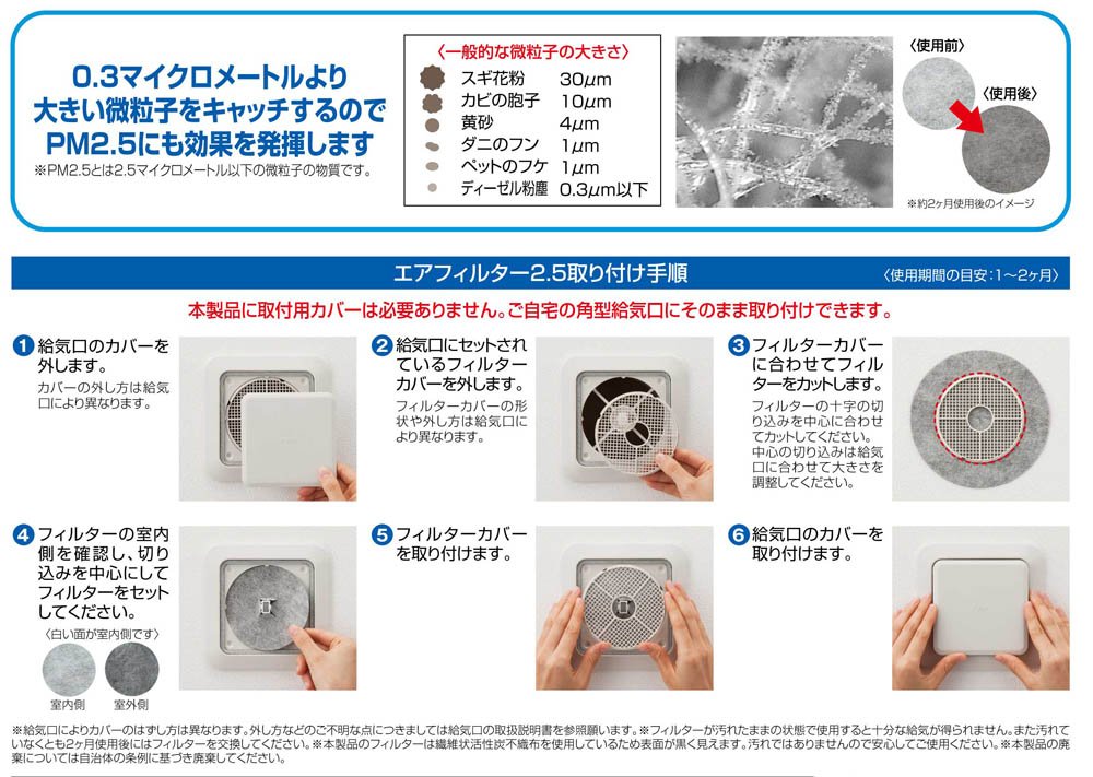 ● Since electrostatically charged filters catch particulates larger than 0.3 micrometer, it also works for PM 2.5
