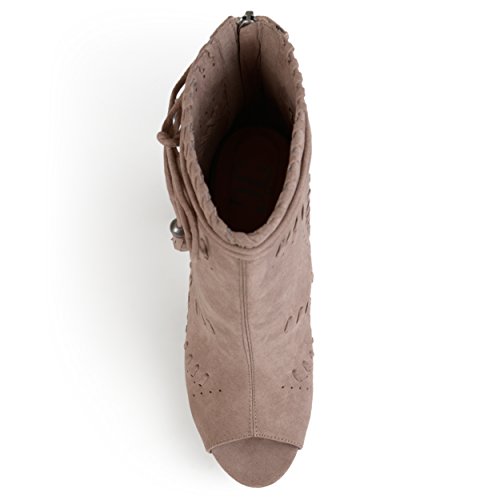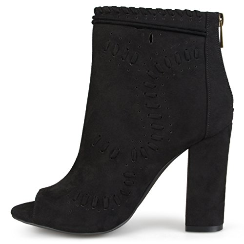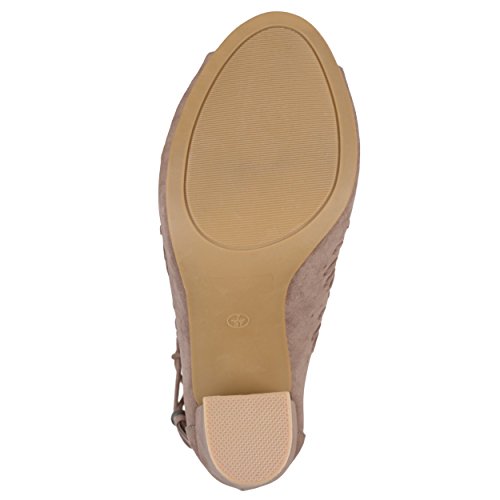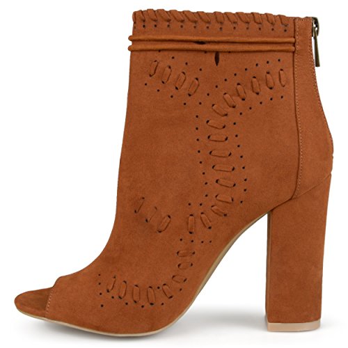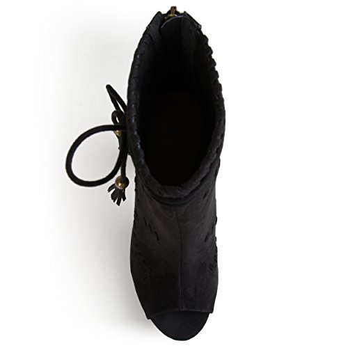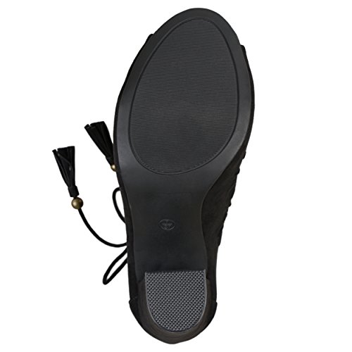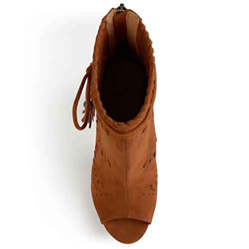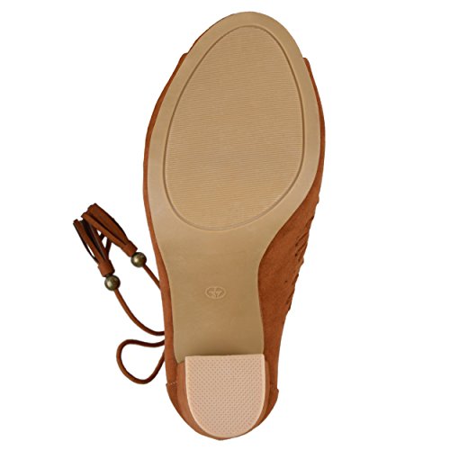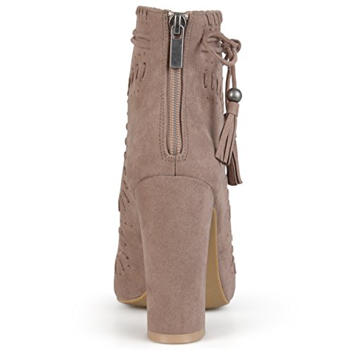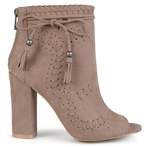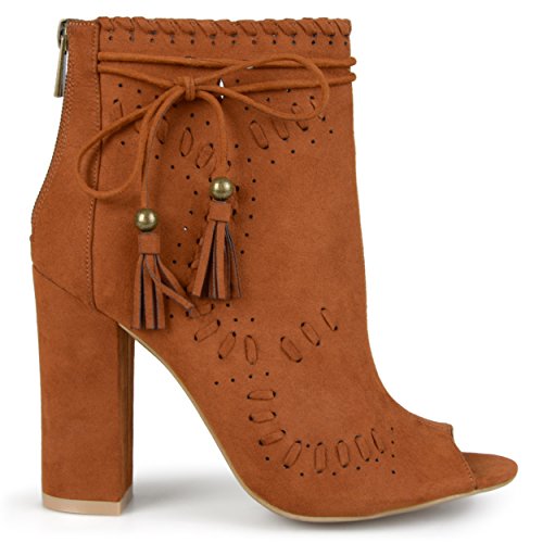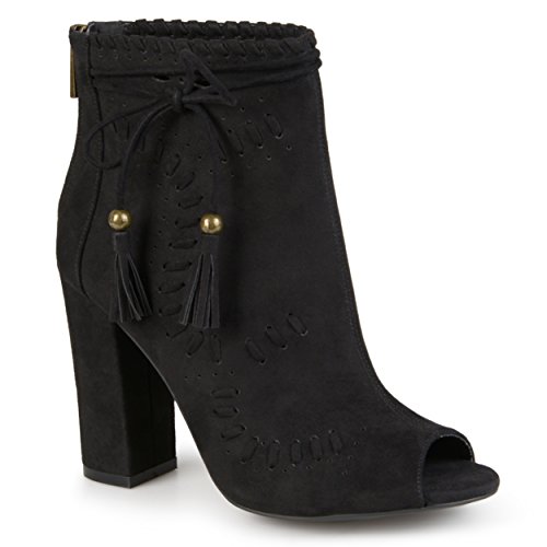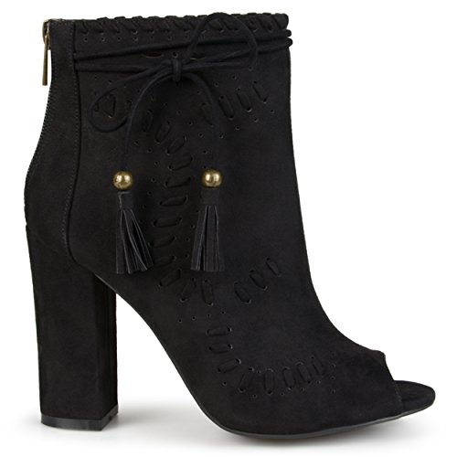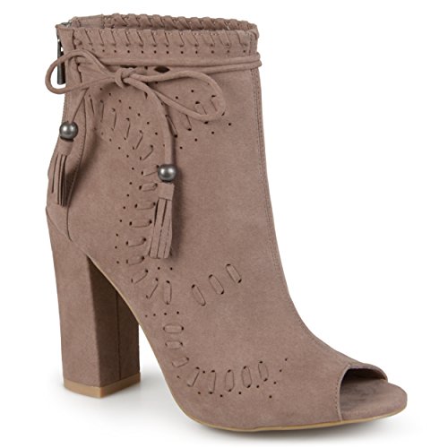 Binding : Apparel Product Description Create your chic style in moccasin shoes by Brinley Co. Premium faux suede uppers highlight a decorative lacing and pinhole texture. A sleek bow with tassel detail accents the ankles and tall chunky heels create a must-have boho style. 0