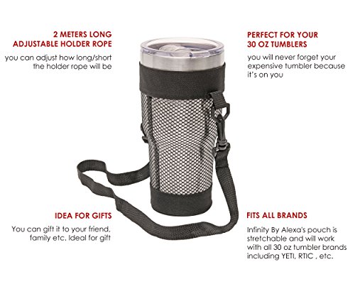 -. Brand : Infinity By Alexa -. Color : black -. Feature : Perfect for your 30 oz tumblers - you will never forget your expensive tumbler because it's on you. deal includes 1 pouch. does not include tumbler! / Fits All brands - Infinity By Alexa's pouch is stretchable and will work with all 30 oz tumbler brands including YETI, RTIC , etc. / 2 Meters long adjustable holder rope - you can adjust how long/short the holder rope will be. / Ideal for gift -. Label : Alex International -. Manufacturer : Alex International -. PackageQuantity : 1 -. ProductGroup : Kitchen -. ProductTypeName : KITCHEN -. Publisher : Alex International -. Size : small -. Studio : Alex International -. Title : Pouch To Go for 30 oz stainless steel tumbler/travel mug, 30 oz tumbler accessories, hands free - Infinity By Alexa TRAVEL INSULATED TUMBLERS