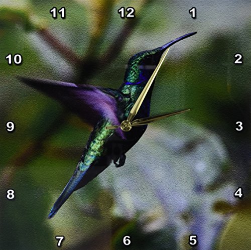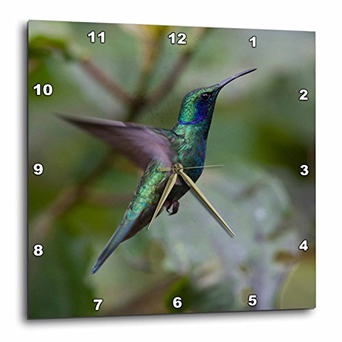 Green violet-ear hummingbird. Monteverde. Costa Rica. Central America. Wall clock is a wonderful complement to any room in your home or office. Made of durable high grade aluminum. This frameless clock has a high gloss mirror like, UV coated, scratch resistant finish and is suitable for a moist environment. Sizes available range from 10x 10to 15x 15. Requires one AA battery; not included. Battery box is not covered.Feature
