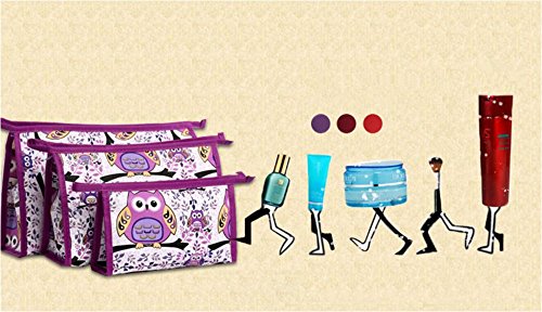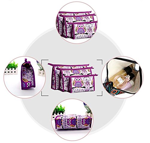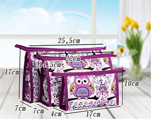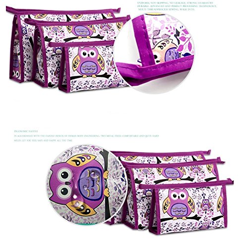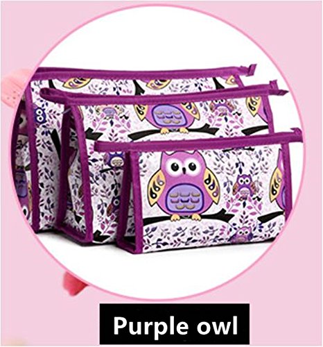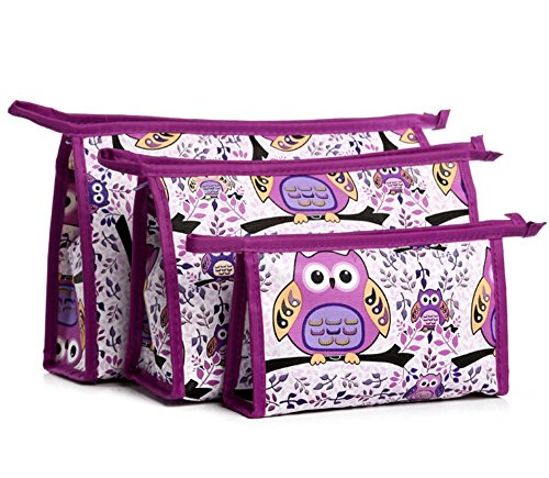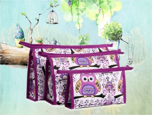 XICHEN 3 in 1 cosmetic bag with Zipper for Vacation, Bathroom, Storage (3 Sizes) (Purple owl)