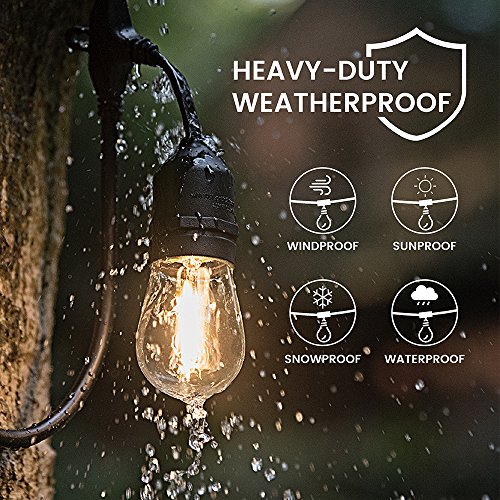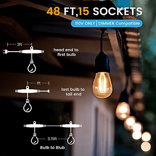 - UL Listed: Commercial string lights, heavy-duty technical grade outer rubber construction, safety and reliable; 48ft total hanging length (end to end); 3ft bulb to bulb spacing; 15 bulbs within string lights (Kindly remind, PACKAGE INCLUDED 18 BULBS ---- If there is still defective bulb occasionally, please replace it with EXTRA 3.)