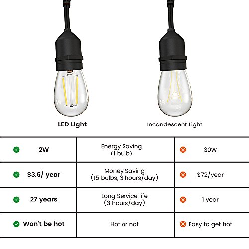 - Energy Saving Long Lasting Led Bulb String Lights: 1) Only 2-watt per led bulb reaches 200lumens brightness and the led bulbs will never get hot; 2) Lifetime lasts for 30,000 hours, 30 times the incandescent bulb light; 3) Energy consumption is only 5% of incandescent bulb light; 4) You just pay for about 3.6 dollar for 1 year and use up to 27 years (If using 3 hours per day)