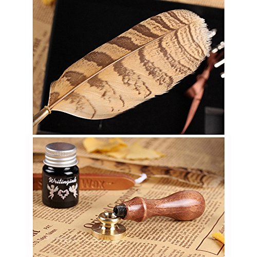 -. Feature : Feather pen length: 22cm/8.7inch; / Made of high quality pure copper material,einforced root feathers,safe and durable; / Retro style,vampire seal,with 5 pen nibs can be replaced,easy bleeding ink, smooth writing; / Beautiful luxury case,top quality pen kit with ink and steel tips,for holidays,Christmas,birthdays,all occasions; / Package include:1*natural owl feather pen+1*flexible pen+1*bottle of ink+1*red beech wood paint seal+1*red gold wax;