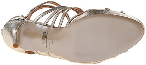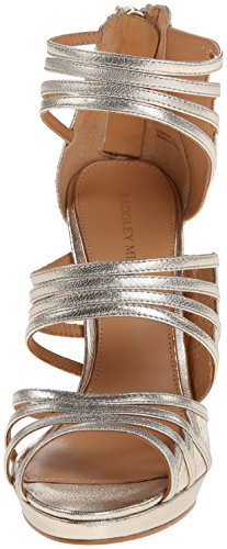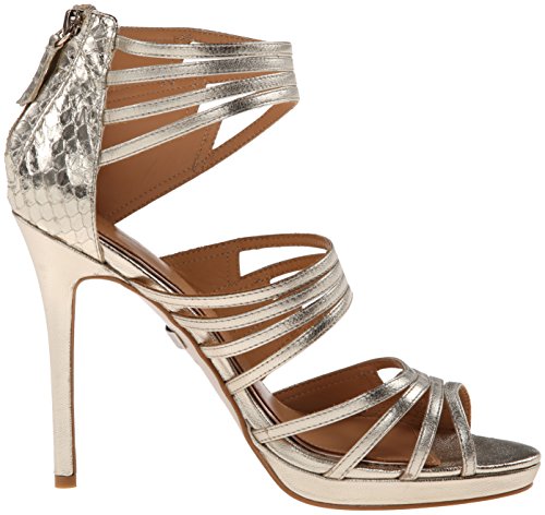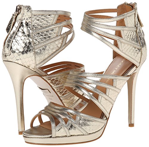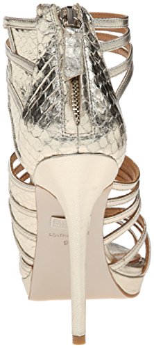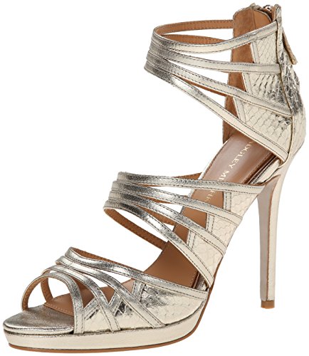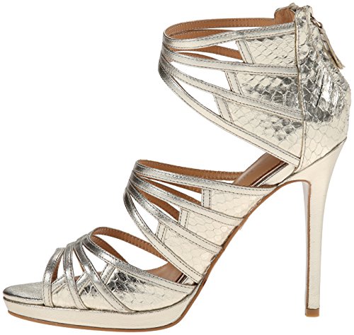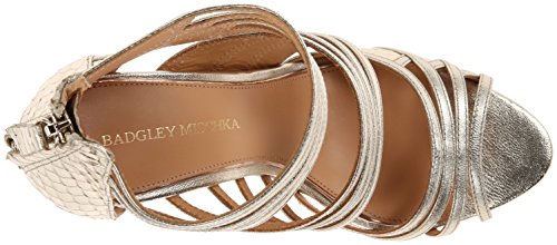 Studio : Badgley Mischka Footwear Publisher : Badgley Mischka Footwear Binding : Shoes Product Description Glamorous Badgley Mischka sandals in metallic leather. Groups of skinny straps detail the upper, and scale embossing highlights the heel cap. Back zip. Covered platform and stiletto heel. Leather sole. 0