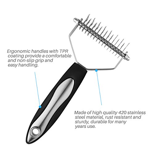 COMFORTABLE, STRONG, DURABLE: Made of 420 stainless steel material, rust resistant and sturdy; Ergonomic handle with TPR coating provides a comfortable and non-slip grip to prevent hand and wrist strain no matter how long you brush your pets.