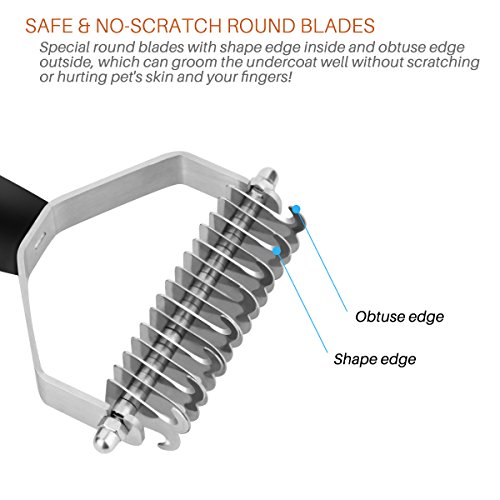 NO SCRATCH & NO PAIN: Special round blades that sharp on the inside but rounded on the outer edge, enable you a much safer experience than the traditional sickle shape mat combs. Makes it much safer and more comfortable on pet skin than the traditional sickle shape mat comb.