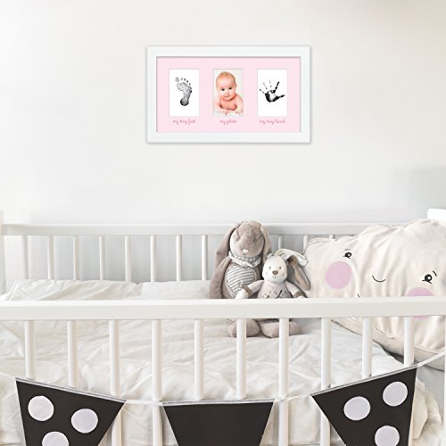 Includes: 1 Tiny Ideas Baby's Handprint & Footprint Keepsake Photo Frame Kit with 1 standard ink pad, framed wall décor with plastic frame, acid-free beveled matting, plastic backing, plexiglass cover and attached wall mount