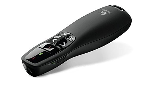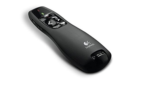 The Logitech Wireless Presenter R400, with a red laser pointer, is designed to help you make your point in a smaller meeting room setting, and is easy to see against most backgrounds and projection surfaces. A battery power indicator ensures you always have the power you need to finish your presentation, while a range of up to 50 feet (15 meters) lets you move around the room for more engagement with your audience. The intuitive slideshow controls help you find buttons easily by touch, and the compact design allows you to take it with you wherever you go. Plus the contoured shape feels great in your hand, so you'll be comfortable no matter how long the presentation lasts. Technical Specifications: Dimensions (height x width x depth): 1.49 in (37.8 mm) x 4.55 in(115.5 mm) x 1.08 in (27.4 mm) Weight: 2.01 oz (57 g). Receiver Dimensions (height x width x depth): 0.65 in (16.5 mm) x 2.31 in (58.6 mm) x 0.31 in (7.9 mm). Receiver Weight: 0.21 oz (6 g). Color: Black. Laser Class: Class 2 Laser. Max Output: Less than 1mW Wave Length: 640?660nm (red light). Battery type: 2 AAA batteries. Battery life (Laser pointer): 20-hour maximum. Battery life (Presenter): 1050-hour maximum. Wireless operating distance: Approx 10m. Wireless technology: 2.4GH?wireless technology