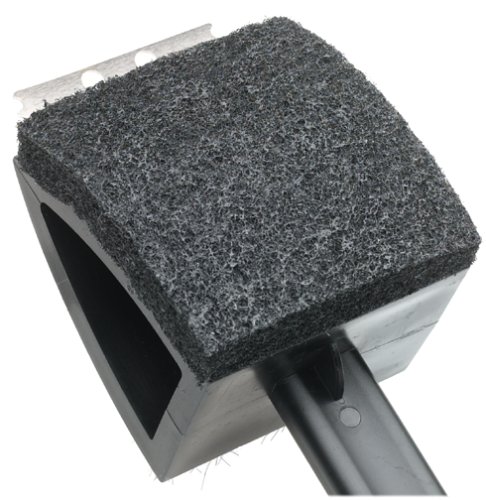 - Feature : 18-inch-long oversized dual grill cleaning brush / Durable Stainless Steel Bristles / Abrasive Pad Scrubber / Steel scraper on end / Long plastic handle with ribbed grip and thumb notch
