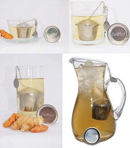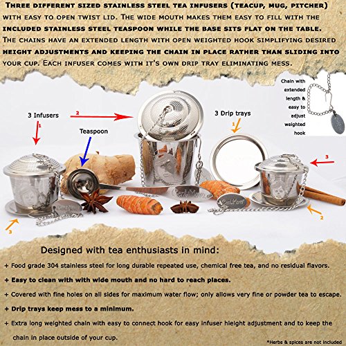 Special design will not allow chain will not fall into cup. Includes no mess drip trays. Easy to clean. Fine holes on all sides for maximum water flow. Not for very fine or powder teas.