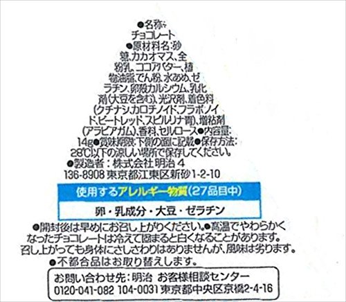 原材料:砂糖、カカオマス、全粉乳、ココアバター、植物油脂、でん粉、水あめ、ゼラチン、卵殻カルシウム、乳化剤(大豆を含む)、光沢剤、着色料(クチナシ、カロチノイド、フラボノイド、ビートレッド、スピルリナ青)、増粘剤(アラビアガム)、香料、セルロース