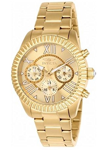 -. Binding : Watch -. Brand : Invicta -. Color : gold -. Department : Womens -. EAN : 0886678262694 -. Feature : Get the best in scratch and shatter resistance with Flame fusion crystal. Now there is no need to sacrifice one for the other / Quartz movement with analog display and flame fusion crystal dial window / Water-resistant / Gold-tone stainless steel case with gold-tone dial / Water resistant to 10 ATM / 100 meters / 330 feet : suitable for snorkeling as well as swimming but not diving -. Label : invicta -. Manufacturer : invicta -. Model : 21423 -. MPN : 21423 -. NumberOfItems : 1 -. PackageQuantity : 1 -. PartNumber : 21423 -. ProductGroup : Watch -. ProductTypeName : WATCH -. Publisher : invicta -. Studio : invicta -. Title : invicta womens angel 21423 gold tone watch -. UPC : 886678262694