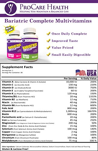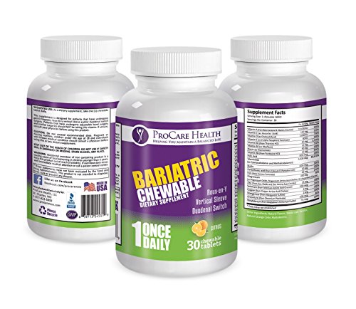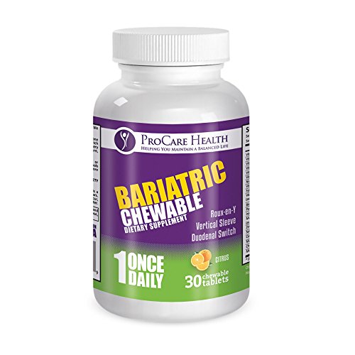-. Binding : Health and Beauty -. Brand : ProCare Health -. Color : Wheat Yellow -. EAN : 0609224256110 -. Feature : **New Enhanced Absorption Formula 4/16**Once a Day Complete- The only once per day Bariatric vitamin that meets or exceeds ASMBS Guidelines* / New and Improved formula (4/16) offers even better bio-availability! Easier absorption for your body. / Value Priced 30 Day Supply Chewable for $13.99 That's a savings of $20-$45 over other Bariatric vitamins. / Specially Crafted and Formulated by leading Bariatric Doctors, Dietitians and Nutritionists.Full GMP Compliance since inception / Easily Digestible . Minimal use of binders and fillers makes us smaller and easier to take! -. IsAdultProduct : 0 -. Label : ProCare Health -. Manufacturer : ProCare Health -. Model : PC001 -. MPN : PC001 -. NumberOfItems : 1 -. PackageQuantity : 30 -. PartNumber : PC001 -. ProductGroup : Health and Beauty -. ProductTypeName : HEALTH_PERSONAL_CARE -. Publisher : ProCare Health -. Studio : ProCare Health -. Title : Bariatric Complete Chewable Multi-Vitamin Once Per Day 30 count- Designed for RNY, Sleeve, Bypass and Switch Surgery Patients- 1 month Supply -. UPC : 609224256110
