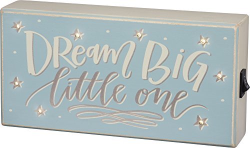 Studio : Primitives By Kathy Publisher : Primitives By Kathy Binding : Baby Product Product Description Night Light Dream Big! is the message on this adorable LED night light in blue with tiny little lights within some of the stars.. Measures 8" x 4" Soft gentle blue and embellished with gray and cream color lettering. 0