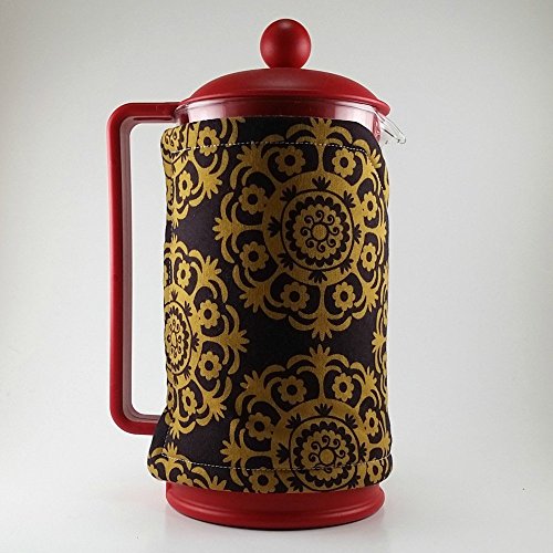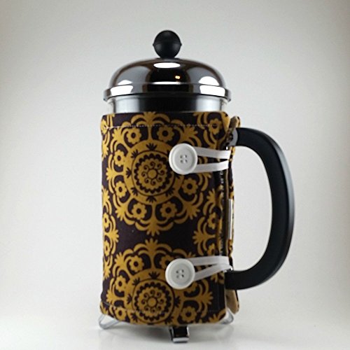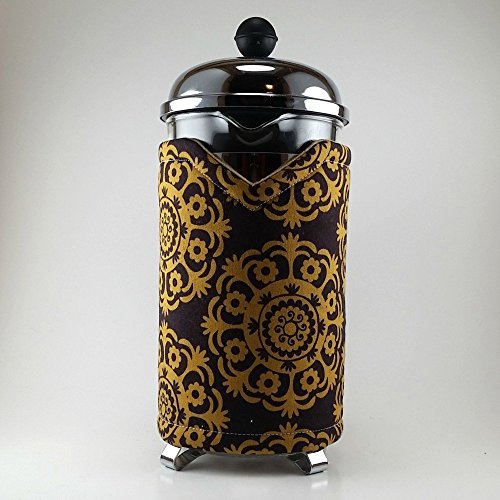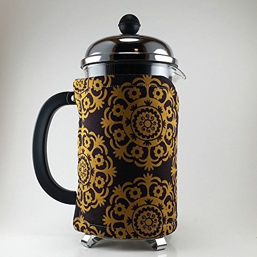 Product Description In the right home, this deep gold and chocolate brown print is going be a stunning addition. This is a handmade french press cozy, made to fit an 8 cup press. Made with 100% cotton print, insulated with Insul-Bright and lined with cozy cotton flannel fabric. Two 1/4 inch straps loop easily over two buttons for an easy placement. Top stitching in a coordinating color for a quality finish. 0