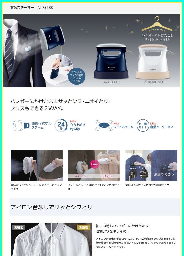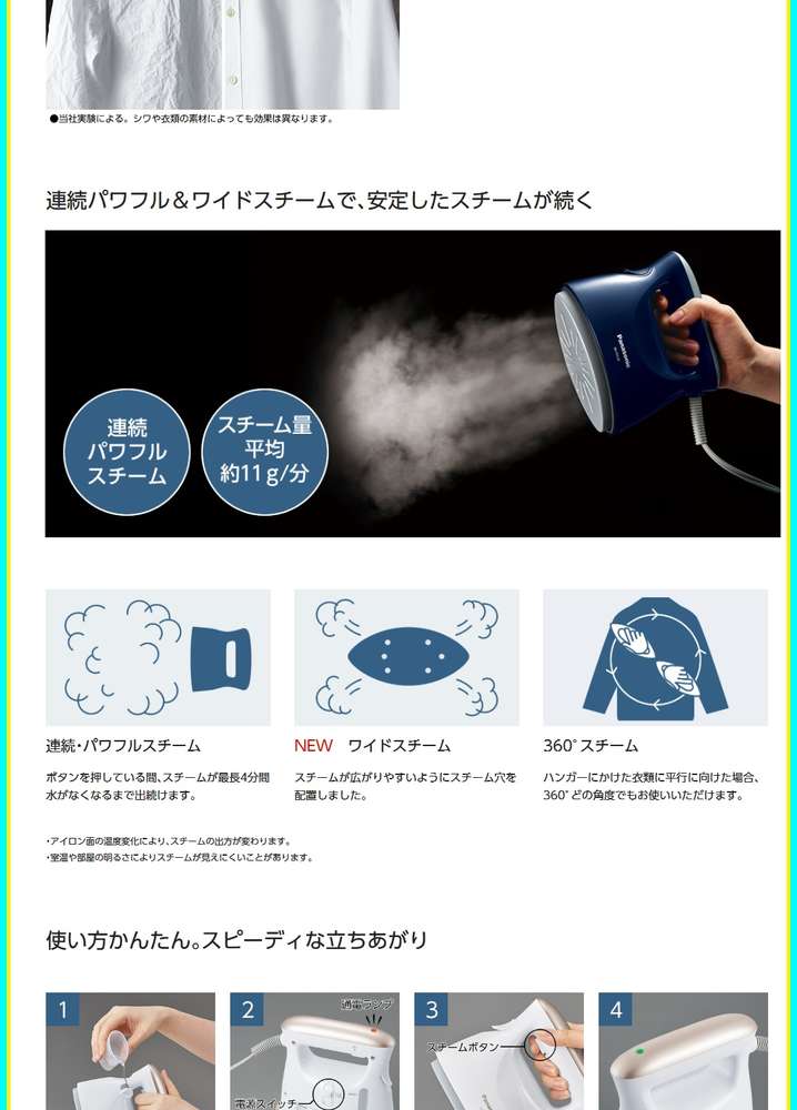 ●360°スチーム・・・ハンガーにかけた衣類に平行に向けた場合、360°どの角度でもお使いいただけます。