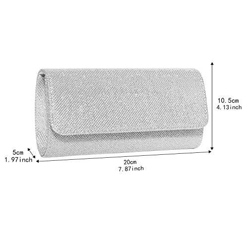 -. Feature : Size: W7.87, H1.97, D4.13" (20 x 5 x 10.5cm) / Features: Sparkly glitter detail, Front flap with magnetic button closure. One internal pocket /patch with High quality and durable hardware frame / 45" Detachable shoulder strap / 3 in 1 bag(evening bag,handbag,cross-body bag) / Inner Material: Textile