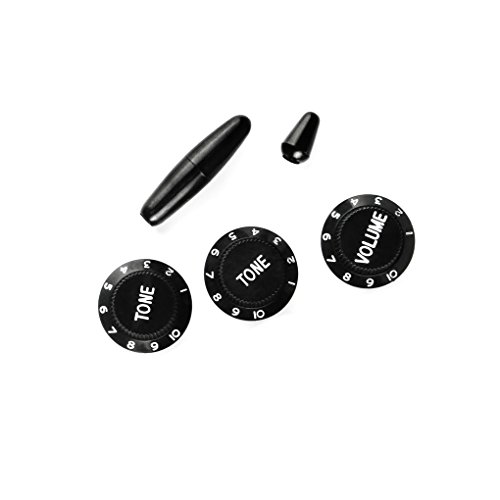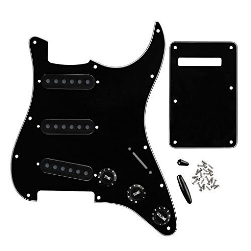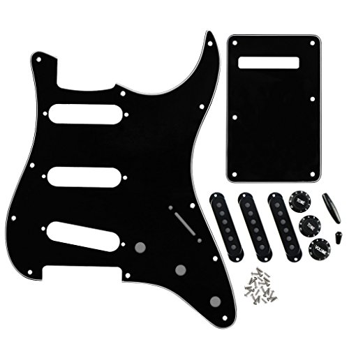 Product Description Feature:* Set of gutiar pickguard, back plate, pickup covers, knobs and tip for Fender Style Strats Standard Stratocaster Modern Style Gutiar or similar replacement.* All materials are environmentally friendly, thermostability, no smell. Multi-layer plates are pressed under high temperature and pressures, to make them close integration between each layer, will not appear curly, deformation, or separation of different layers.* Two layers of protective films on the front of pickguards, anti-scratch to protect the guitar.Specification:* Item: Guitar pickguard Guitar back plate 50/52/52mm Pickup covers 2T1V knobs 5 Way switch tip.*Pickguard: SSS(single/single/single coil) style pickguard; 11 screws holes in the side of pickguard.* Back Plate: L- 145mm, W- 93mm.* Material: Pickguard and Back Plate is made of 3Ply PVC; Guitar Parts: Plastic PVC.* Pickup covers: 50/52/52mm pole piece holes for single coil pickups.* Knobs: 2pcs Tone and 1piece Volume knobs* Swith Tip: for a 5 Way Strat Style Guitar switch or similar.* Pickguard Color: Black; Guitar Parts' Color: Black, will be sent the same like the pictures showed.* Note: Item's color might be different from the picture because of the aberration. Package Includes:1 x Pickguard1 x Back Plate3 x Pickup Covers2T1V Knobs1 x 5 Way Switch Tip1 x Bar Tip25 x Screws 0