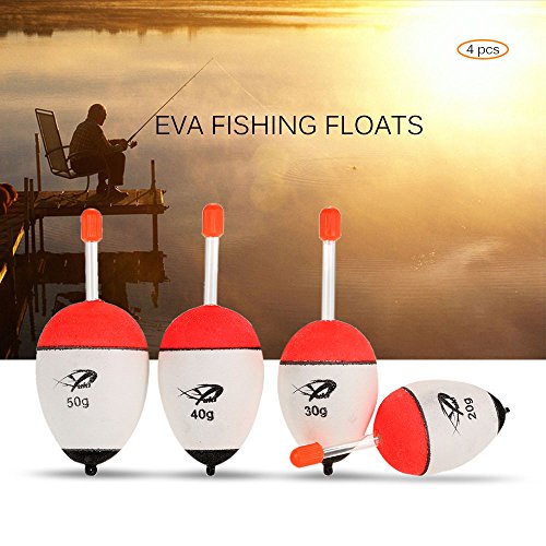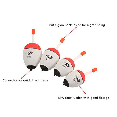 -. Binding : Misc. -. Brand : Lixada -. EAN : 0749029854088 -. Feature : 4pcs a set with assorted sizes: 20g,30g,40g,50g. / Made of EVA, with good flotage. / Quickly clip onto the fishing line with the connector. / Insert your glow stick into the top tube to attract game fish in dark. / Suitable for saltwater and freshwater. -. Label : Lixada -. Manufacturer : Lixada -. MPN : RNZ9674748238480QG -. PartNumber : RNZ9674748238480QG -. ProductGroup : Sports -. ProductTypeName : SPORTING_GOODS -. Publisher : Lixada -. Studio : Lixada -. Title : Lixada 4PCS 20g 30g 40g 50g EVA Fishing Drift Floats Assorted Sizes Fishing Buoy Fishing Tackle -. UPC : 749029854088