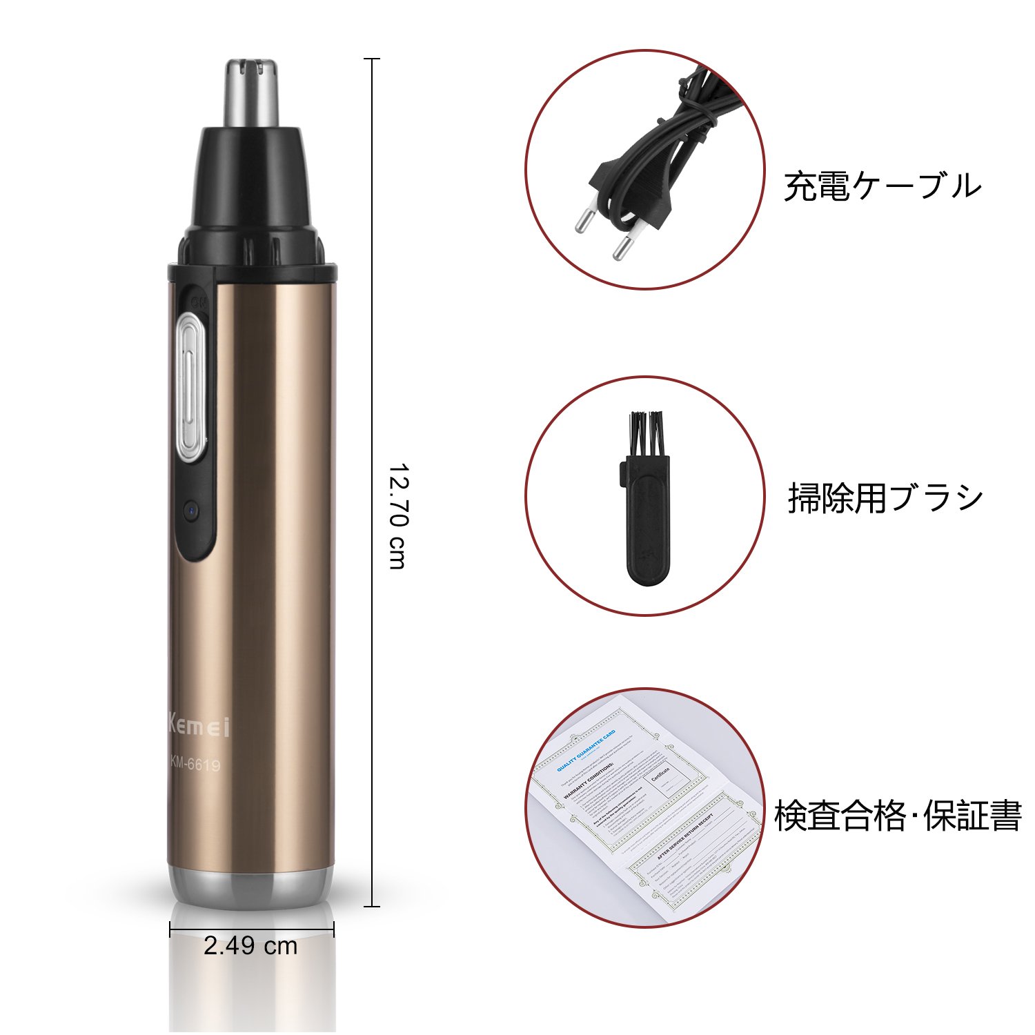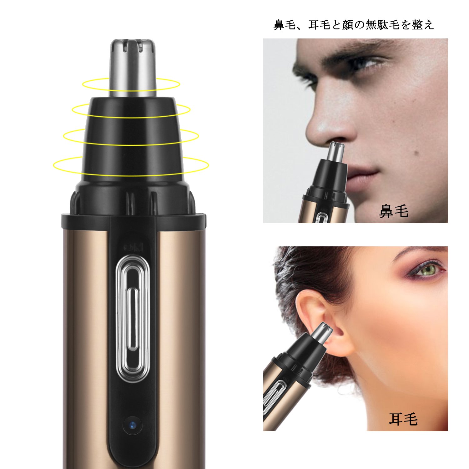 【1台3役】1台で、鼻・耳・眉などの無駄毛を痛みもなく綺麗に除去できます。 【優しい設計】鼻毛・耳毛カッターは、耳や鼻の奥まで届きやすい理想的な角度に設計されており、眉にも使用できます。このトリマーがあれば、鼻・耳・眉などを簡単快適にお手入れできます。 【ヘッド水洗い可】トリマーのカッターヘッドは水洗いOKです。だが、本体は水洗いできません。ご注意ください。 【携帯性抜群】本製品はとてもコンパクトで、携帯性は非常に良いです。旅行、出張などに最適です。