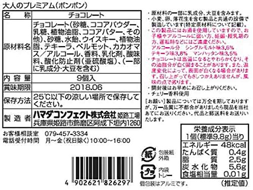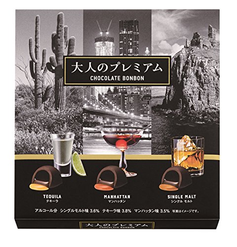 原材料:チョコレート(砂糖、ココアパウダー、乳糖、植物油脂、ココアバター、その他)、砂糖、水飴、ウイスキー、植物油脂、テキーラ、ベルモット、カカオマス/アルコール、香料、乳化剤、酸味料、酸化防止剤(亜硫酸塩)、(一部に乳成分・大豆を含む)