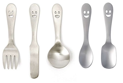 This Happy Face Cutlery Set includes the following 5 Petit Utensils: - Candy Spoon (98 mm) - Fork (99 mm) - Knife (114 mm) - Cream Spoon (100 mm) - Spoon (97 mm)