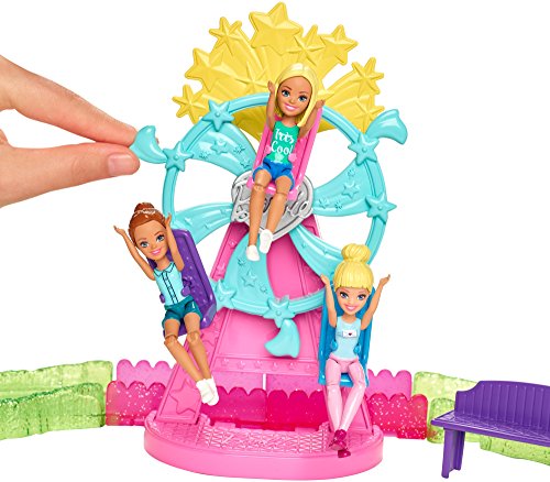 A Ferris wheel is the main attraction! The colorful ride has three seats with clips to hold Barbie On the Go Dolls in place (other dolls sold separately, subject to availability). Turn the crank to spin the wheel and cause a golden "fireworks" display to pop out of the top