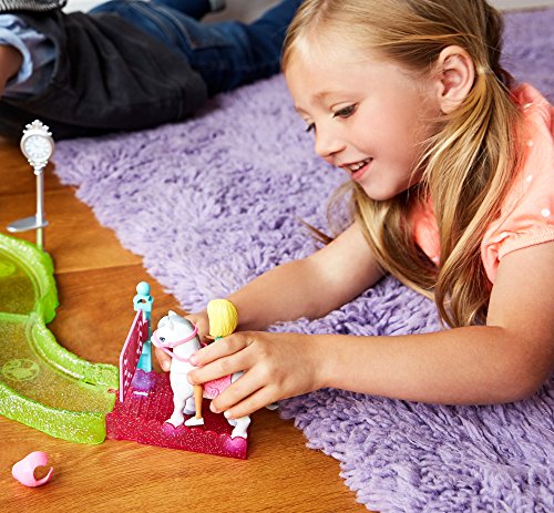 The 10-piece track can be reconfigured in multiple ways and has accessories that feature nine movements activated when Barbie doll passes by on her pony, like a lamppost, clock and signboard that turn, gates that swing and a refreshment stand with twirling sign. A bench and gallery-style game add to the scene