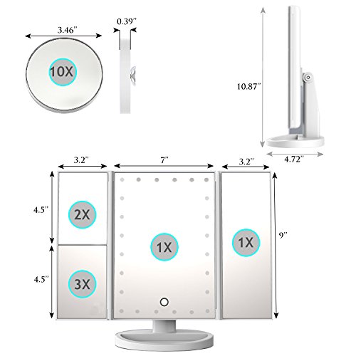 - ✅ 4 MAGNIFICATION MODES:4 Panels provide a wide-angle viewing,1X/2X/3X magnified all in one cosmetic mirror and a removable 10X magnified mirror which is perfect for applying eyeliner,mascara,grooming brows,and tweezing