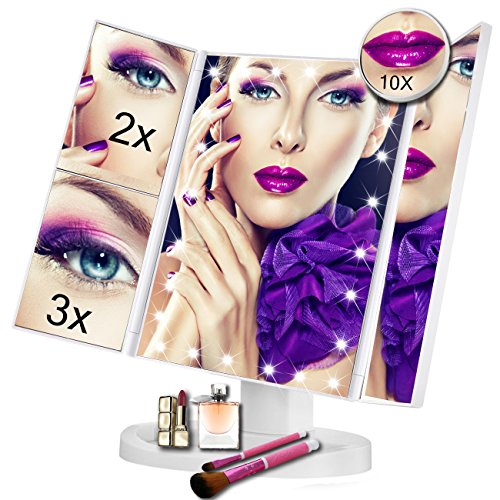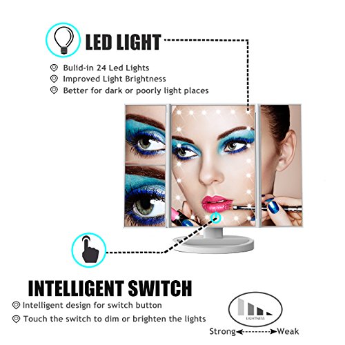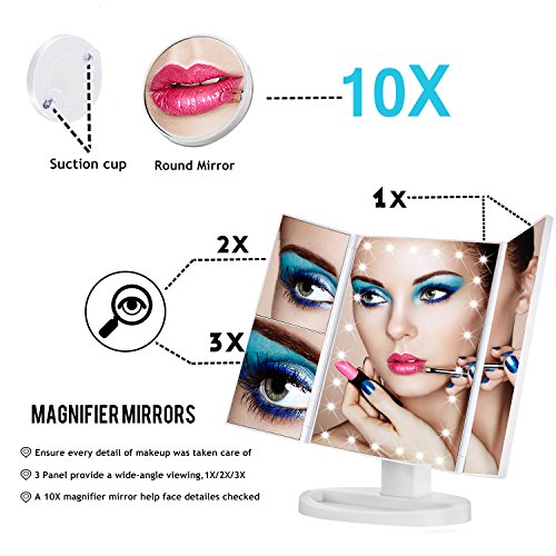 Vanity Makeup Mirror - Trifold Touch Screen 24 LED Lighted,1X/2X/3X/10X Magnification Cosmetic Mirror with 180° Free Rotation for Countertop...