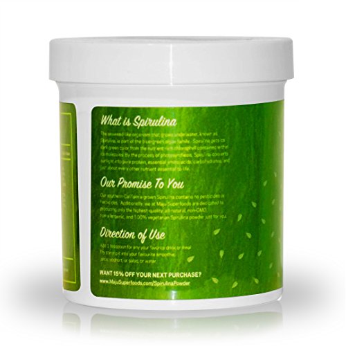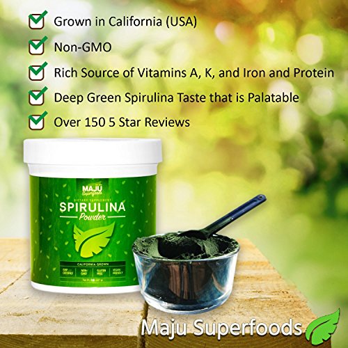 -. Binding : Health and Beauty -. Brand : Maju Superfoods -. Color : Dark Green -. Feature : ★ PROUDLY 100% CALIFORNIA GROWN ★ We challenge you to do your research. All "organic" Spirulina is not a product of the USA, and undergoes a potentially dangerous irradiation process. Why settle for Spirulina from China, Mongolia, or India that may bring harmful contamination? You are probably buying Spirulina because you care about your health. Why not be certain you are choosing the right brand? / ★ BUY 2, GET $5.00 OFF! ★ Use code "BIGSPIRU" to get $5.00 off your purchase of 2, $7.00 off your purchase of 3, or $30.00 off your purchase of 5! Limited time offering. / ★ FREE SPIRULINA RECIPE EBOOK ★ We will send you our top 5 recipes instantly upon purchase. Wondering how to use spirulina powder? This will get you started! / ★ 30 DAY 100% MONEY BACK GUARANTEE ★ Try us out. Heck, even return an empty bottle if you want. If you do not like our product, simply issue refund request. No questions asked -- we do this because are confident you will love the healthy vitamin-packed taste of California grown Spirulina. / ★ BIG VALUE ★ Let's face it -- it costs more to grow Spirulina in California than China. You could pay $25 for a half-pound Spirulina from China, or you could pay a little more for a huge one pound Maju Superfood's California Spirulina Powder. We believe we are offering a superb value. Maju Superfoods prides itself on providing only the most delicious and nutritious Spirulina Powder on the market. Our customers have taste compared us to (and have rated Maju Spirulina Powder higher than) the other top Spirulina brands. Check us out onlline. -. Label : Maju Superfoods LLC -. Manufacturer : Maju Superfoods LLC -. ProductGroup : Health and Beauty -. ProductTypeName : HEALTH_PERSONAL_CARE -. Publisher : Maju Superfoods LLC -. Studio : Maju Superfoods LLC -. Title : California Grown Spirulina Powder: #1 Rated, Non-Irradiated, Non-GMO, Spirulina Recipe eBook with Purchase, Vegan, Gluten-free