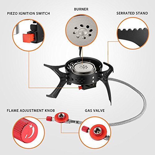 EASY TO IGNITE AND ADJUST FLAME: Simply screw the canister and press the ignition switch to ignite (canister not included); no extra flint needed; the built-in gas control knob allows you to easily adjust the flame