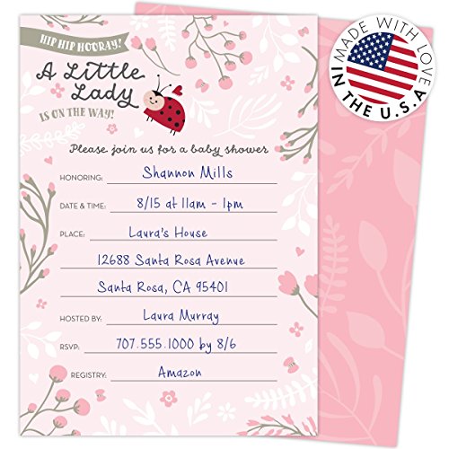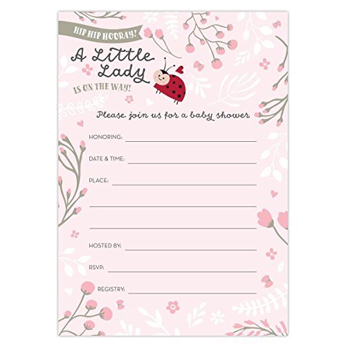 Little Lady on the Way Baby Shower Invitations for Girls, Set of 25 Fill-In Style Cards and Envelopes. Ladybug Theme with Pink and White Flowers,...