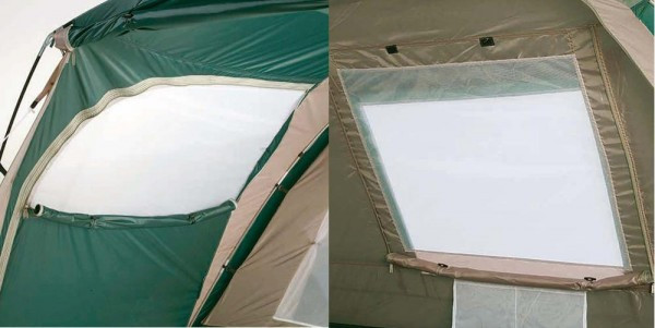 | 前面のひさしを広げ、左右を巻き上げれば、開放的なリビングスペースを確保できます。リビングとインナーテント内にメッシュ窓を各2カ所に装備。メッシュ窓には、通気性とプライバシー保護を両立するノーシームメッシュを採用。UV-PROTECTIONコーティング生地を使用しています。収納や持ち運びに便利なキャリーバッグ付き。 |