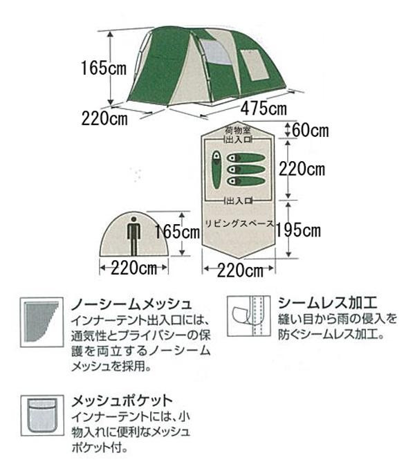 | 素材・材質 | フライ:ポリエステル70D(PU1000mm)、インナー:ウォール:ポリエステル70D(通気性撥水・防水)、グランドシート:ポリエステル150D(PU1000mm)、メッシュ:ポリエステルノーシームメッシュ、ポール:Φ11.2mmグラスファイバー |