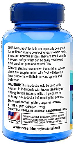Ocean blue® DHA for Kids Minicaps® are specifically designed to provide children DHA during critical developmental years to help the brain, eyes and nervous system. Small, good-tasting softgels that can be easily swallowed and provides pure and natural DHA. Benefits: 250 mg of DHA per softgel DHA for Kids: Brain and eye health through a child's developing years Supports brain function and memory Regulates mood Excellent for kids who have difficulty swallowing