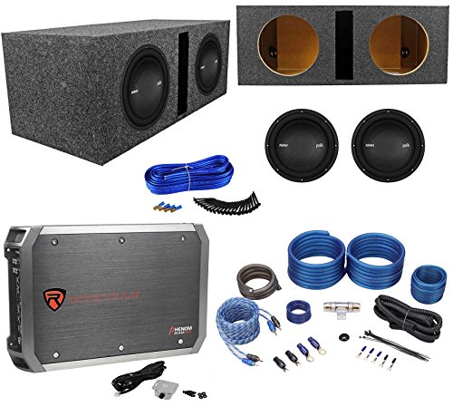-. Feature : Package Includes : (2) Polk Audio MM1042DVC 10" 2400 Watt Dual 4-Ohm Car or Marine Subwoofers + Rockville RXD-M2 750 Watt RMS - CEA Compliant Mono Class D 1 Ohm Car Stereo Amplifier + Rockville RWK41 4 Gauge 2 Channel Complete Wire Kit With RCA Cables + Rockville RDV10 Dual 10" 1.1 Cu. Ft. Vented Subwoofer Enclosure With Grade A 3/4" MDF + Dual Enclosure Wire Kit With 14 Gauge Speaker Wire + Screws + Spade Terminals / Polk Audio MM1042DVC 10" 1200 Watt Dual 4-Ohm Car/Marine Audio Subwoofer Sub . Driver Compliment: 10" (254mm). Cutout Dimensions: 9" (230mm). Mounting Height: 0.55" (14.06mm). Mounting Depth (Top): 4.6" (115mm). Mounting Depth (Bottom): 5" (129mm). Peak Power Handling: 1200 Watts. Continuous Power Handling: 400 Watts RMS. Nominal Impedance: 4 Ohms. Frequency Response: 28Hz-200kHz. / Rockville RXD-M2 3000 Watt/1500w RMS Mono Class D 1 Ohm Car Stereo Amplifier With Optical Coupler Technology. CEA Compliant Power Ratings . 1 Ohm: 750 Watts x 1 Channel <1% THD+N . 2 Ohm: 550 Watts x 1 Channel <1% THD+N. 4 Ohm: 400 Watts x 1 Channel <1% THD+N) . RMS Power Ratings:. 1 Ohm: 1500 Watts x 1 Channel. 2 Ohm: 1100 Watts x 1 Channel. 4 Ohm: 800 Watts x 1 Channel. / 1 - 17' High Grade Twisted Pair of 100% Copper RCA Cable. 17' - 4 Gauge Translucent Blue SuperFlex Power Cables. 17' - 18 Gauge Blue Remote Cable. 17' - 16 Gauge Clear Speaker Wire. 3' - 4 Gauge Clear SuperFlex Ground Wire. Gold Plated AGU Heat Resistant Fuse Holder. 60 Amp AGU Gold Plated Fuse. 7' Split Tube Loom. Accessories Included: Wire Ties, Ring Terminals, Butt Connectors, Spades, and Grommets. / Rockville RDV10 Dual 10" Vented Subwoofer Enclosure. Proudly Made In The USA, Using Only The Finest Quality Materials - For The Best Level of Performance From Your Subs!. 3/4" USA Heavy Duty MDF Construction. Machine precision cut mounting holes. Top of the line Glue for extra durable adhesion. High quality GOLD spring loaded terminals. Designed, tested, and engineered to work with most of today's popular woofers.